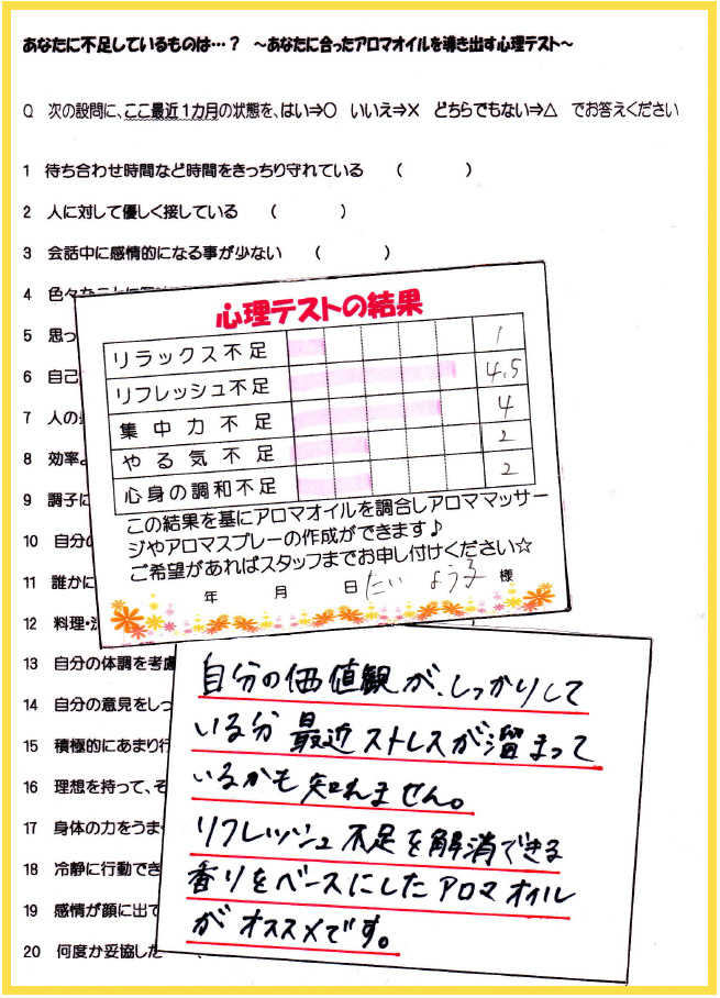 心理テストを用いたカウンセリングにより、性格や心身の状態を導き出し、あなたに今必要とされる「香り」を選定します。アロママッサージでは、お好きな香りのアロマオイルと相性を見極めオーダーメイドで調合したブレンドオイルを使用します。 オーダーメイドのブレンドオイルは1,000円で販売していますのでご入用の際にはスタッフまでお気軽にお声をおかけください。 |