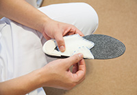 問診、静的/動的観察の情報をふまえて、患者様の歩行に最適なインソールを製作します。製作したインソールを入れ、さらに歩行観察を繰り返し、正常なバランスになるまで微調整を繰り返します。